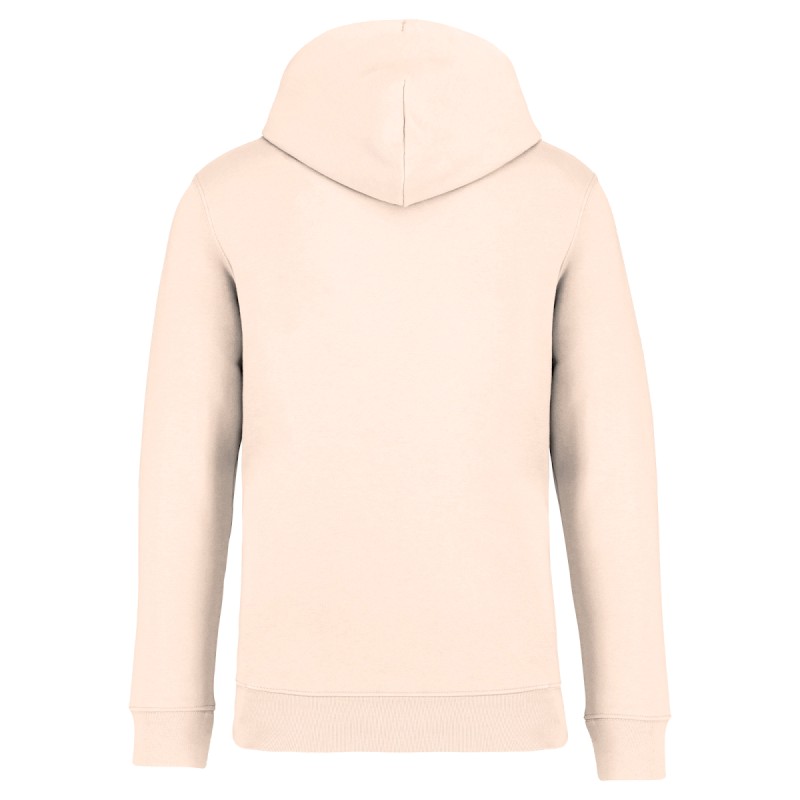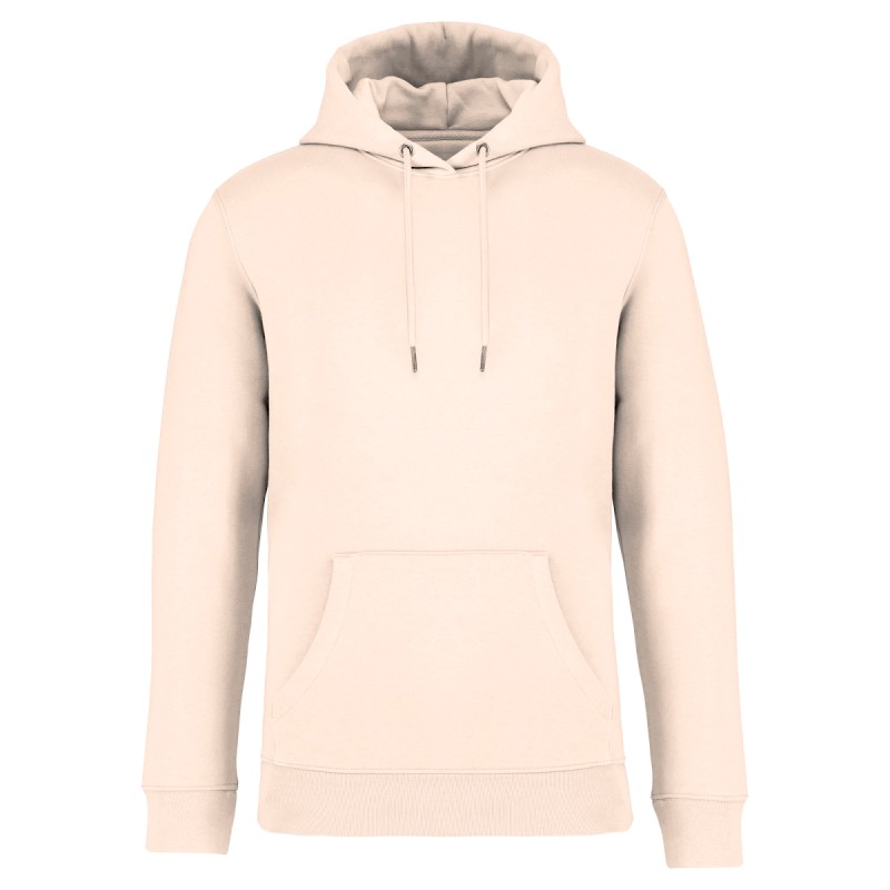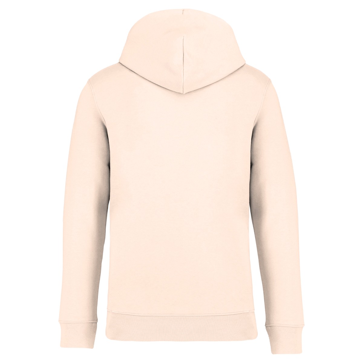 85% coton biologique / 15% polyester recyclé post-consumer. Coton peigné ringspun. Coupe ajustée. Lavé aux enzymes. Molleton gratté 3 fils LSF (Low Shrinkage Fleece : molleton pré-rétréci). 1/2 lune au dos. Poche kangourou. Bord cote 1 x 1 bas de vêtement et bas de manches. Double surpiqûre bas de manches, emmanchures, bas de vêtement et 1/2 lune. Bande de propreté intérieur encolure dos. Capuche doublée en matière principale avec point d’arrêt cordon. Cordon rond avec embouts et oeillets en métal recyclé. La couleur Raw Natural se distingue par son aspect brut visuellement texturé, parsemée de fines particules visibles à l’œil nu.