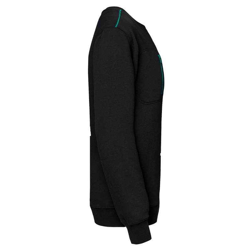 70% polyester / 30% coton. Coton peigné. Molleton gratté LSF (Low Shrinkage Fleece) 3 fils. Fil Vortex. Lavable 60°C. Coupe ajustée. Encolure ronde avec bord-côte 1x1 et bande de propreté ton sur ton avec passepoil contrasté. Finition demi-lune encolure dos pour faciliter la personnalisation de marque à l'intérieur. Passepoil contrasté sur épaules. Poche poitrine côté droit avec zip contrasté nylon et tire-zip contrasté. Finition double aiguille ton sur ton sur le pourtour de la poche. Etiquette de marque Tear Away.